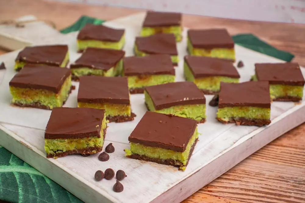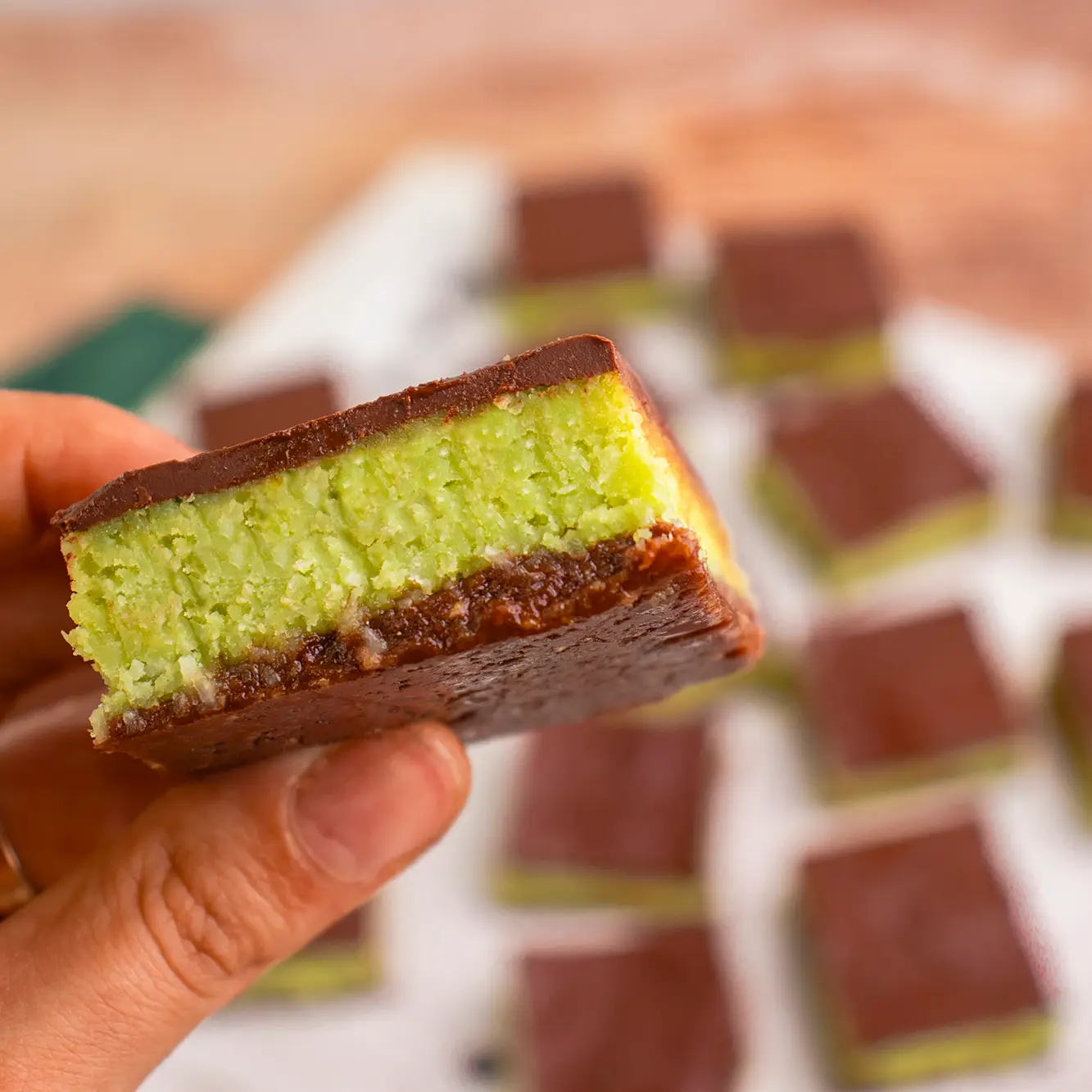 5) Melt the chocolate and stir with the hazelnut butter in a bowl until smooth. Pour over the top of the green slice and return the dessert to the freezer for about one hour until is completely set.