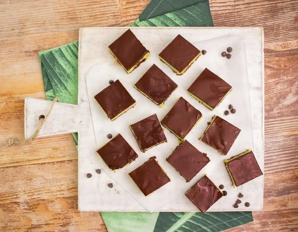 5) Melt the chocolate and stir with the hazelnut butter in a bowl until smooth. Pour over the top of the green slice and return the dessert to the freezer for about one hour until is completely set.