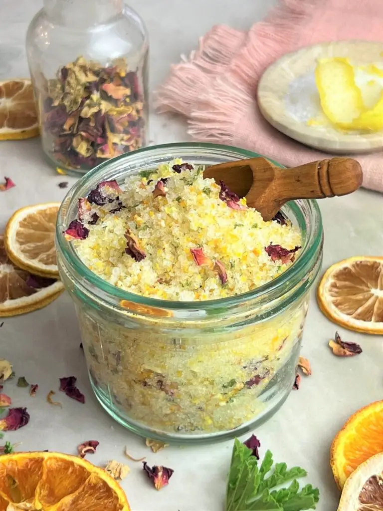 - Add the blended citrus to the Epsom salts, essential oils, dried rose petals and melted coconut oil and mix well until combined.