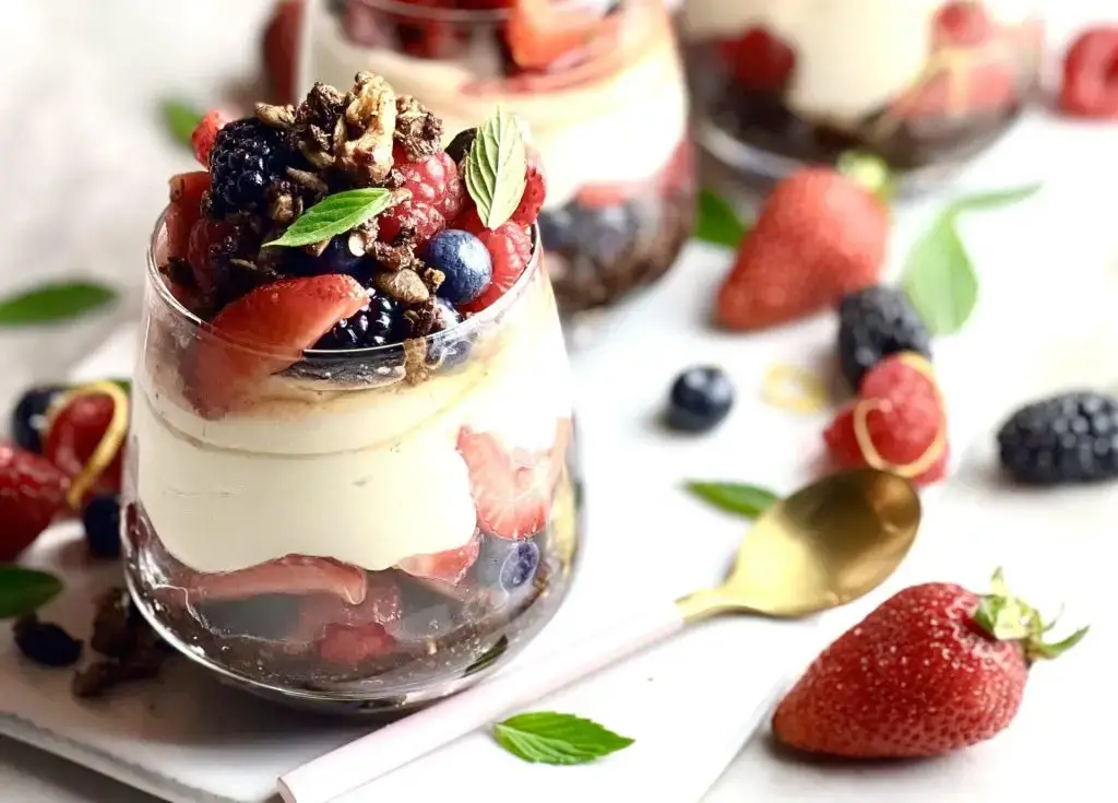 - Spoon or pipe the yoghurt mix into the glasses, top with the berries and garnish with the extra granola. Refrigerate until set, approx. 20 – 30 minutes, or overnight.