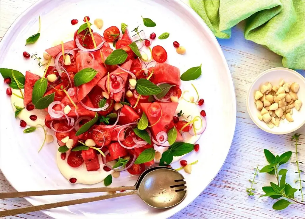 - Into a large bowl, add in the sliced watermelon, red onion, mint, thyme, sliced tomatoes and lime zest. Toss gently and set aside in the fridge.
