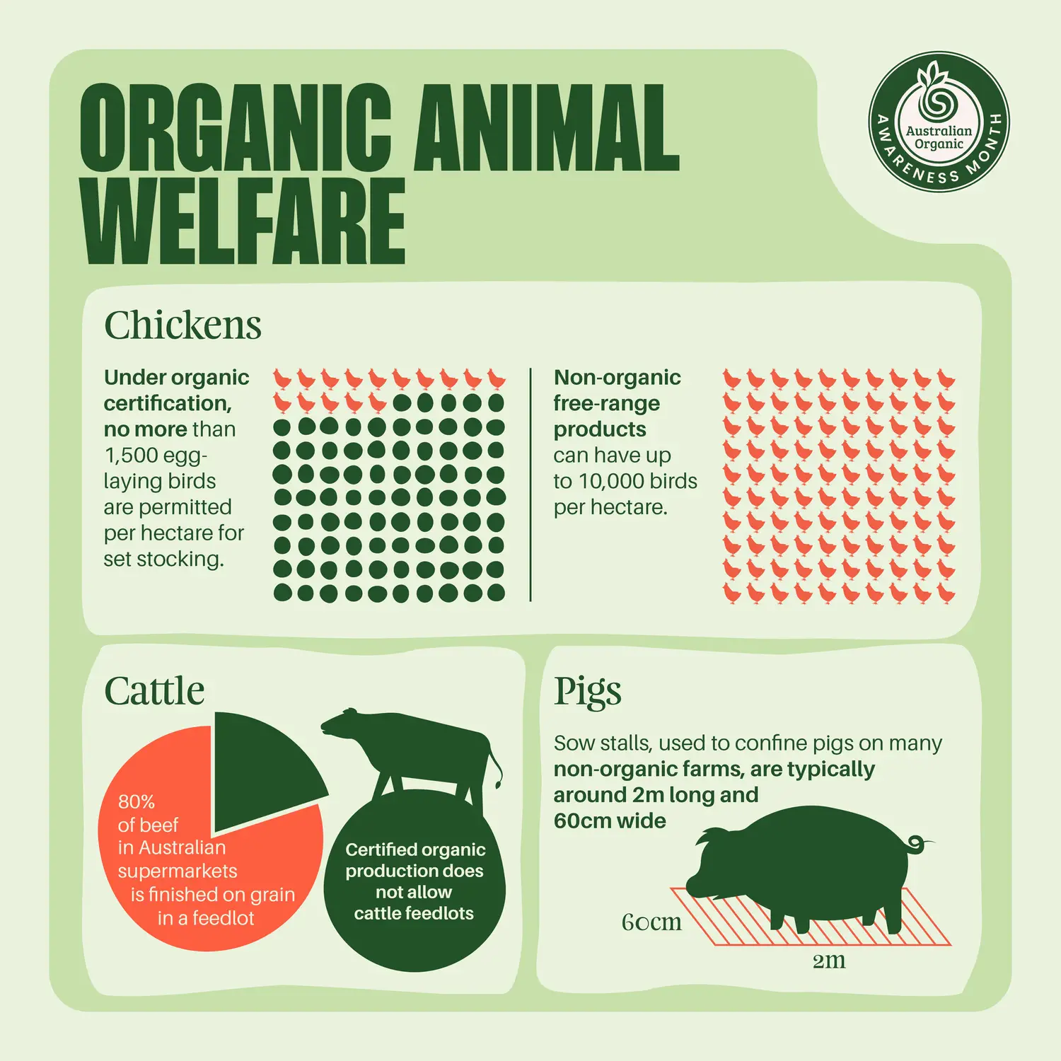 When it comes to animal welfare, there are strict rules in place on certified organic farms. Animals including poultry, pigs, sheep, goats and cattle must live, grow and breed naturally in group sizes appropriate to their species, with more space to roam compared to their non-organic counterparts. Cattle feedlots are prohibited, as is battery farming or cage farming of hens.