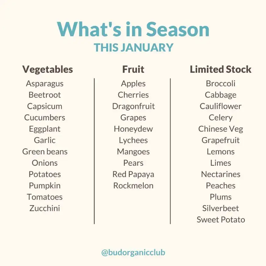 Traditionally the vegetables that are in full supply during January are as follows: asparagus, beetroot, green beans, cucumbers, capsicum, eggplant, tomatoes, zucchini, garlic, onions, potatoes and pumpkin.